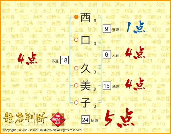 西口久美子さんの運勢 | 姓名判断 名前の画数から無料で |