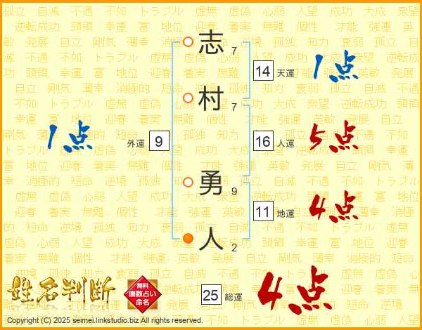 サマリー:志村勇人さんの総運は25画の吉! 個性 才能 強運 英敏 発展 自立 剛気 |